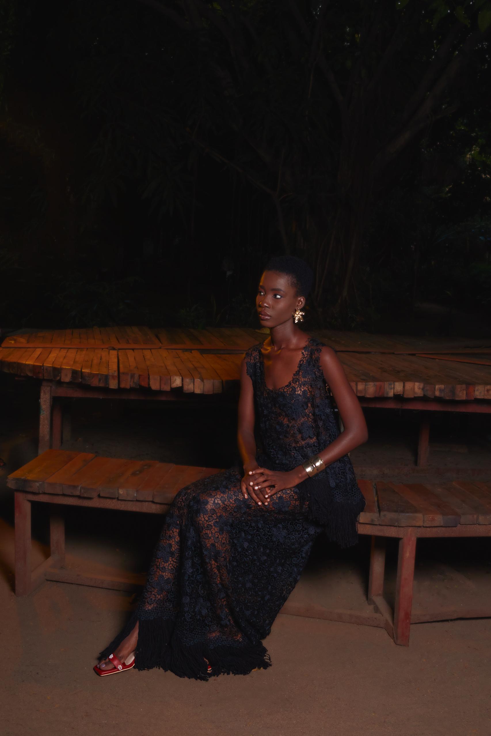 HIGH WAISTED, SHEER LACE SKIRT FEATURES DELICATE FLORAL PATTERN AND A FRINGE DETAILING ON THE HEM