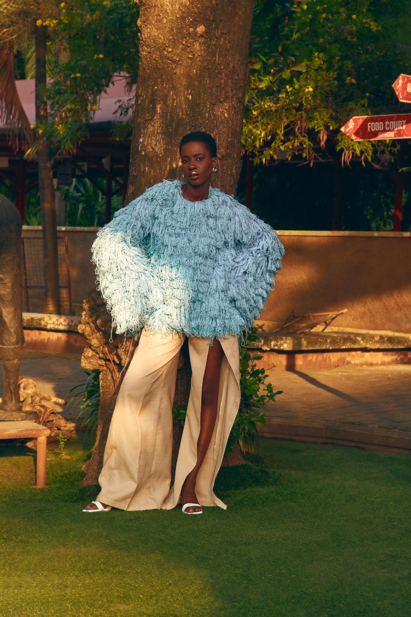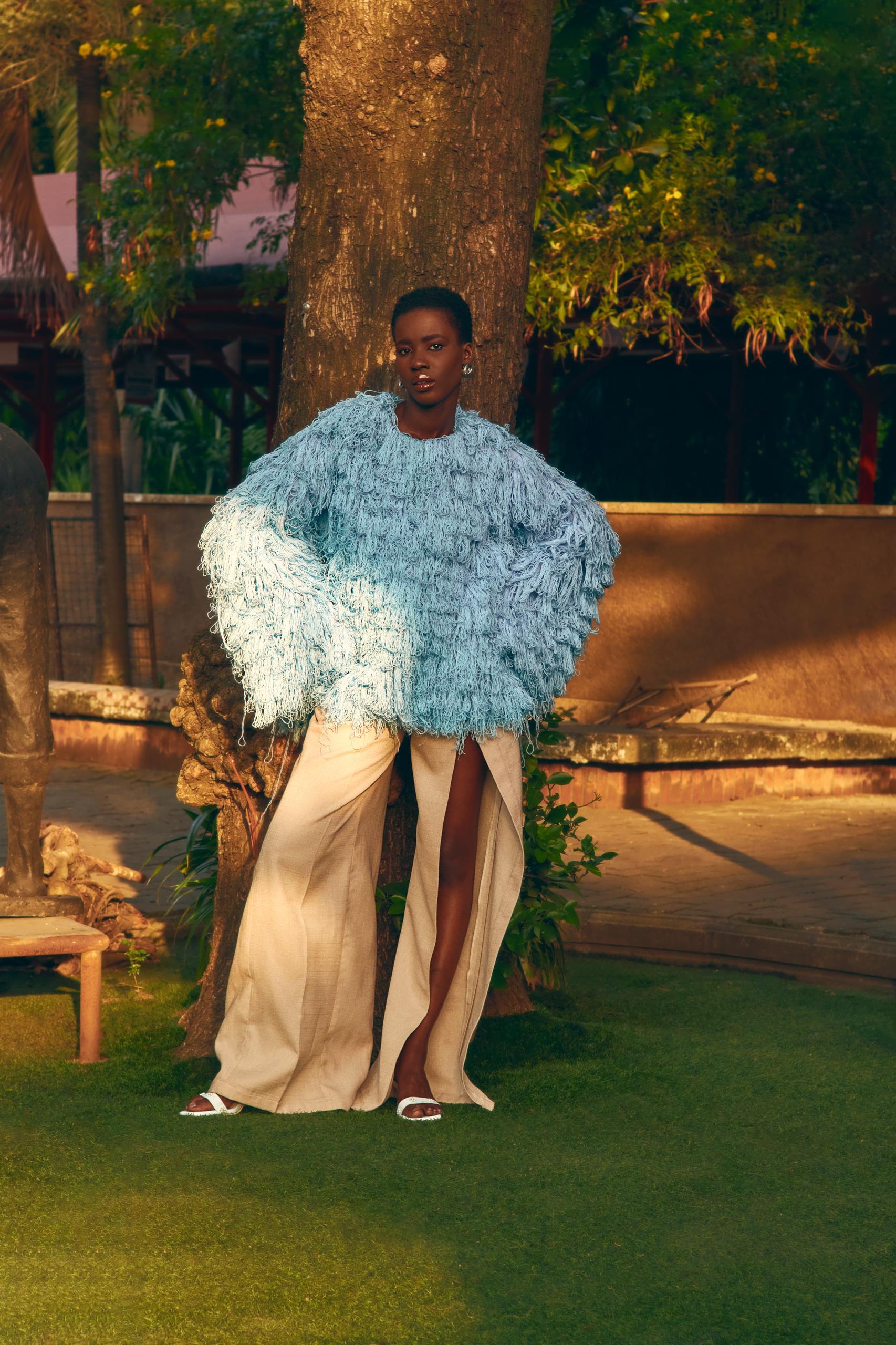 SPECIALIZED WOVEN AND FRINGED 3D COTTON ASO-OKE TOP. OVERSIZED FIT.